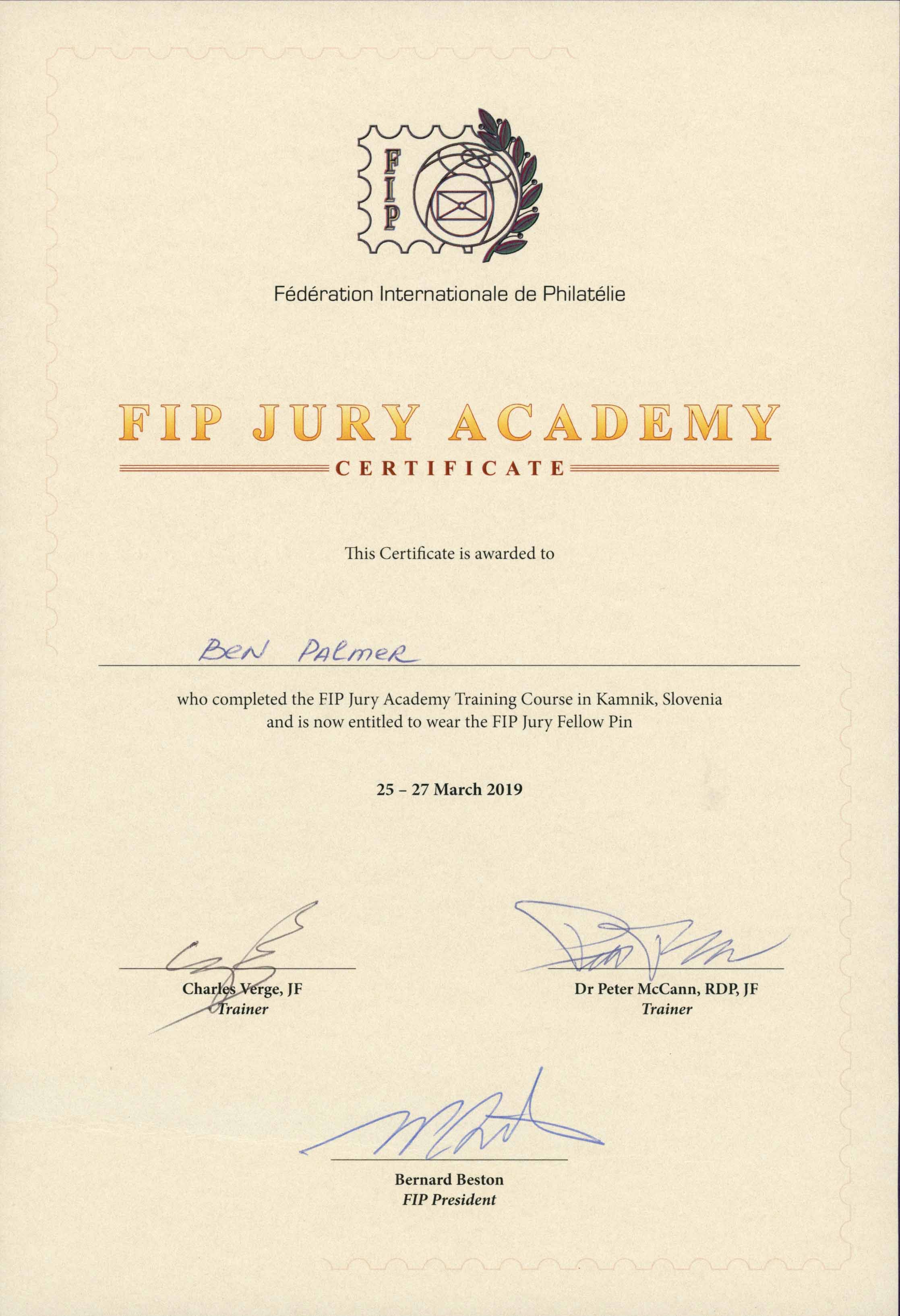 Ben Palmer attended the first FIP Jury Academy Course to be held in Europe at Kamnik, Slovenia, just outside the capital Ljubljana on 25-27 March 2019. International Jurors were accommodated and had their meals provided for by the FIP and their sponsors.